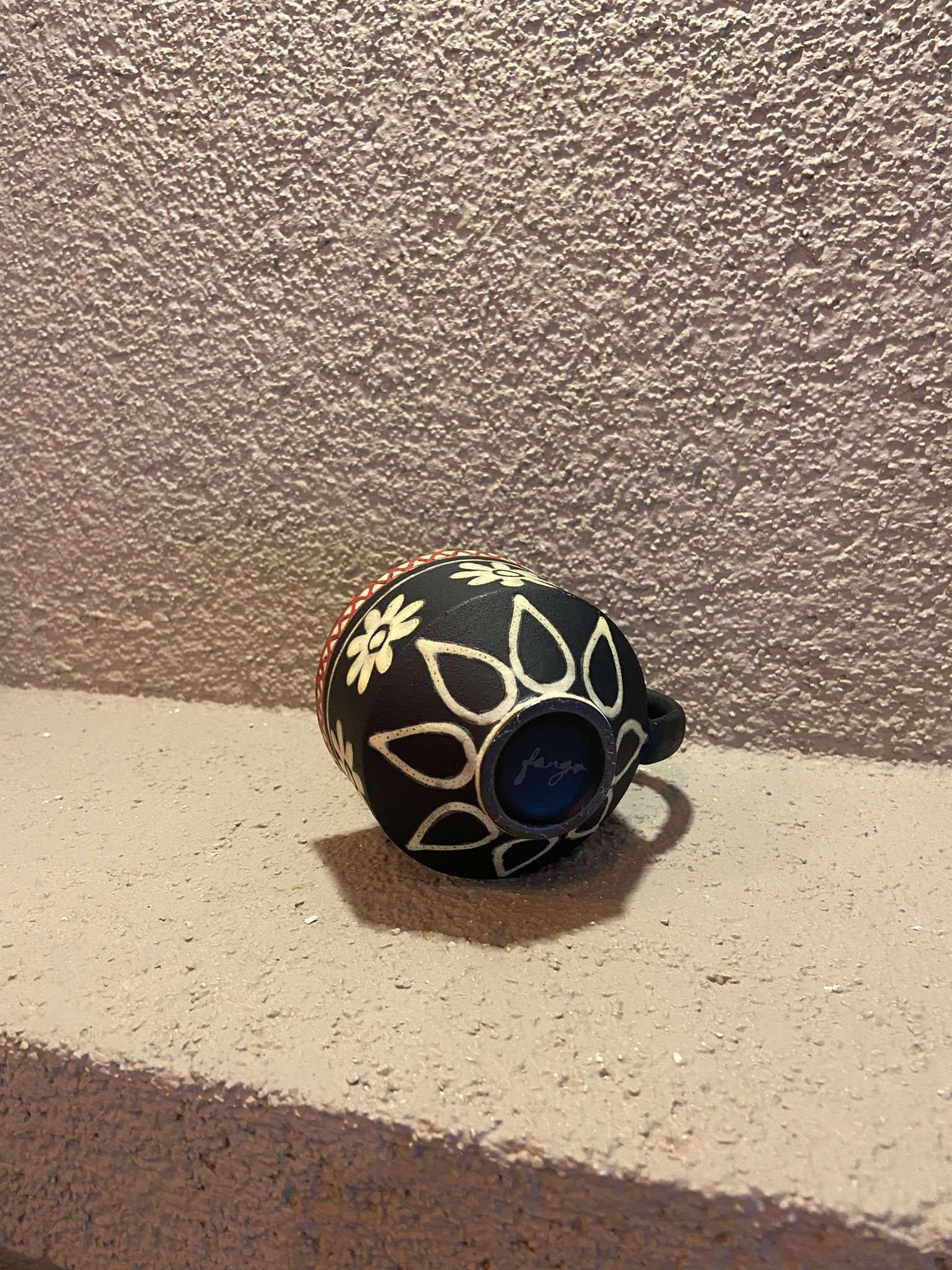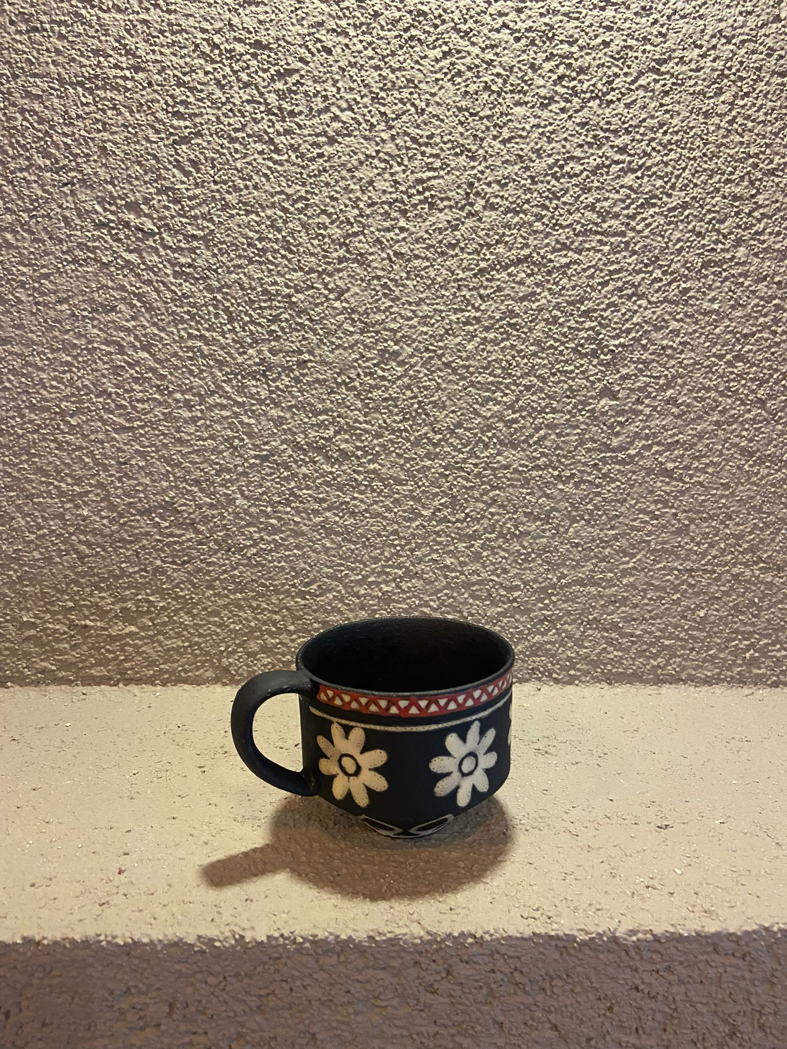Doğal dokusu ve zarif el işçiliğiyle öne çıkan bu seramik fincan, beyaz çiçek desenleri ve kırmızı işlemeli detaylarıyla estetik bir görünüm sunar.
